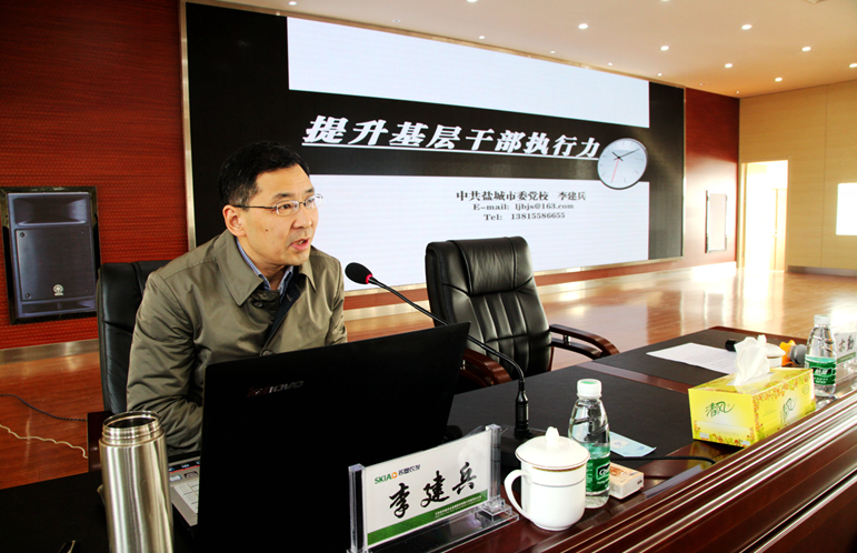 會議邀請了鹽城市委黨校黨委委員、教育長李建兵作《提升基層干部執行力》的專題輔導。李教育長分別從樹立執行意識、融入執行團隊、構建執行流程、規范執行程序四個方面,系統闡述了如何提升基層干部執行力和提升執行力的重要性。