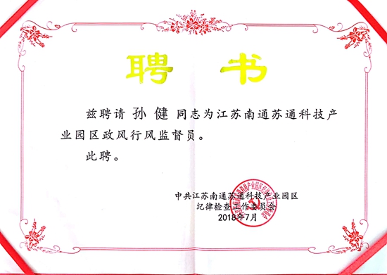 蘇通科技產業園區黨工委副書記金志偉充分肯定了南通公司紀委工作,對墾地廉潔共建和南通公司紀委工作提出了具體要求。座談會上,園區紀工委向南通公司紀委書記孫健頒發了蘇通科技產業園區行風監督員的聘書。