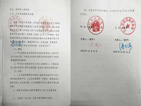 日前,新洋農場與射陽縣人民政府正式簽訂了《江蘇省國營新洋農場學前教育移交協議書》,縣政府依需在農場境內設立公辦幼兒園。
