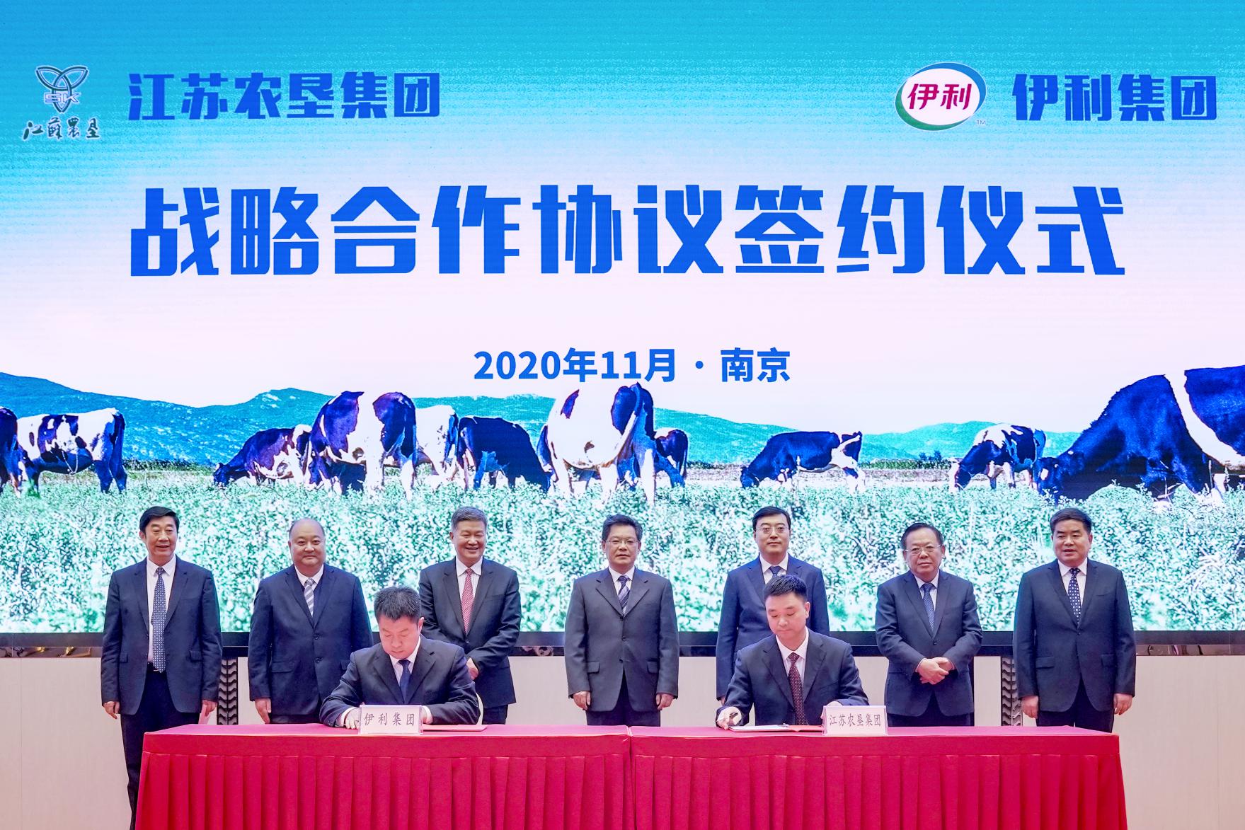 為落實國家及江蘇省奶業振興戰略,實現資源優勢互補,通過強強聯合共同建立長期穩定的戰略合作關系,11月26日,江蘇省農墾集團有限公司與內蒙古伊利實業集團股份有限公司在南京簽署戰略合作備忘錄。省委副書記任振鶴,省委副秘書長趙旻,省農業農村廳廳長楊時云,省國資委一級巡視員王寧生,伊利集團黨委書記、董事長、總裁潘剛,集團公司黨委書記、董事長魏紅軍出席簽約儀式,集團公司黨委副書記、總經理胡兆輝主持簽約儀式。
