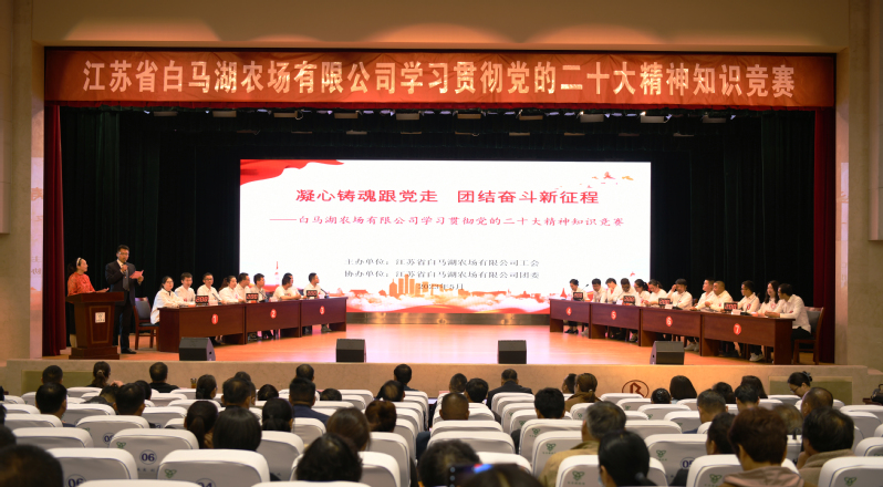 55日,白馬湖農場公司凝心鑄魂跟黨走 團結奮斗新征程學習貫徹黨的二十大精神知識競賽在職工禮堂火熱開賽。黨委書記、董事長韓正光,黨委副書記、總經理韓樹明,副總經理衡愛軍,紀委負責人時奎敬,第二片區財務總監奚興林出席競賽。來自機關和各單位的21支代表隊共計63人參加競賽。