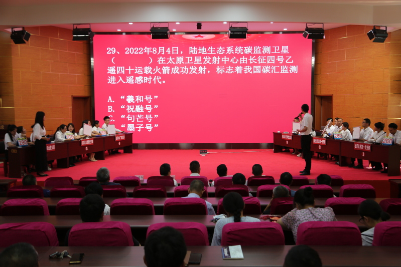 本次比賽分為兩個階段進行,在6月25日的預賽中,全場18支代表隊進行了筆試考核,通過每隊總比分,選出了今天6支參加決賽的隊伍。在主持人的宣布下,比賽正式拉開帷幕。“請聽題,黨的二十大報告指出……請開始搶答。”“請1號臺答題,三號臺搶答犯規……”在現場,6支代表隊“八仙過海各顯神通”,大家“邊賽邊學”、“以賽促學”,在必答題、搶答題和風險題3個環節上充分發揮團隊力量,傾力配合。各支代表隊你追我趕,互不相讓,臺下觀眾也聚精會神,對著屏幕學習黨的二十大知識,現場不時發出熱烈的掌聲。在每個環節休息階段,大會還組織開展了現場互動答題,并準備了精美禮品。現場觀眾紛紛踴躍搶答,再度將本次競賽活動氣氛推向了頂峰。