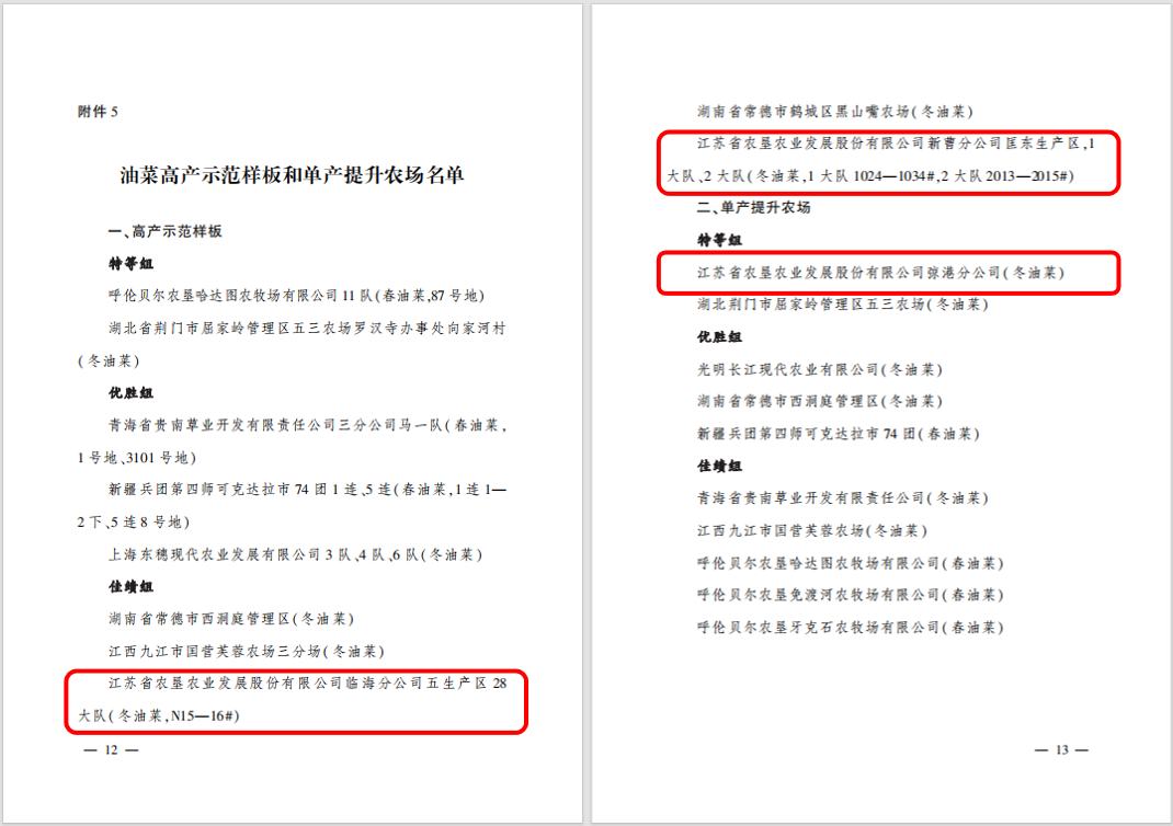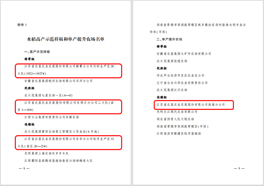 豐收是歲月的恩賜,是大地對勤勞的農(nóng)墾人最好的回報(bào)!近日,農(nóng)業(yè)農(nóng)村部農(nóng)墾局聯(lián)合中國農(nóng)林水利氣象工會(huì)公布了2023年全國農(nóng)墾提單產(chǎn)“大比武”勞動(dòng)競賽結(jié)果,經(jīng)測產(chǎn)驗(yàn)收、綜合評審,共評選出48個(gè)高產(chǎn)示范樣板和47個(gè)單產(chǎn)提升農(nóng)場。江蘇農(nóng)墾下屬江蘇省農(nóng)墾農(nóng)業(yè)發(fā)展股份有限公司(蘇墾農(nóng)發(fā))6個(gè)示范田入選高產(chǎn)示范樣板、3家分公司入選單產(chǎn)提升農(nóng)場。特向入選的單位表示熱烈祝賀!