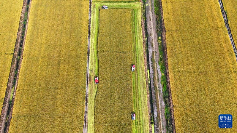 江蘇省連云港市海州區(qū)崗埠農(nóng)場(chǎng)工作人員在搶收水稻(無(wú)人機(jī)照片)。新華社發(fā)(耿玉和 攝)