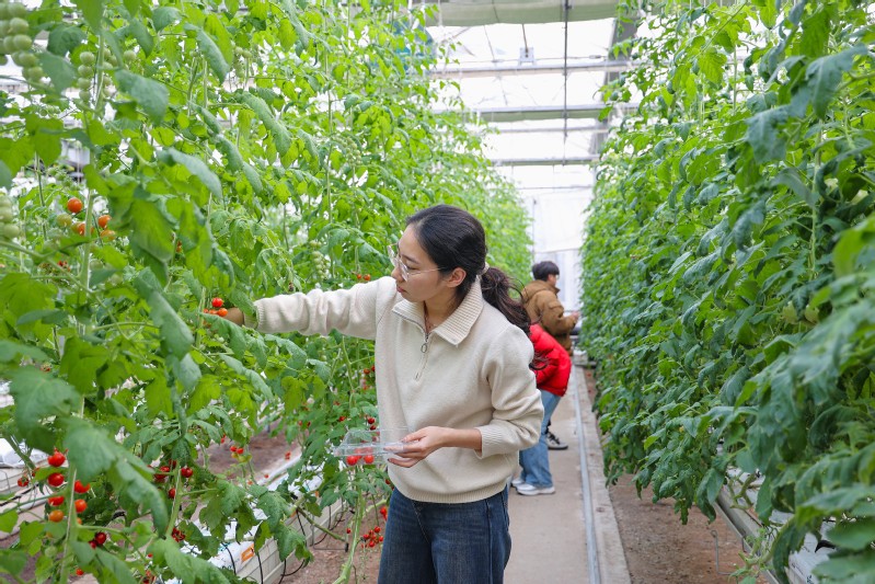 2月12日,在連云港市云臺(tái)農(nóng)場興墾科技番茄采摘智能玻璃溫室大棚內(nèi),工作人員在采摘采用無土栽培技術(shù)種植的西紅柿。 吳成瑤 攝 (視覺江蘇網(wǎng)供圖)