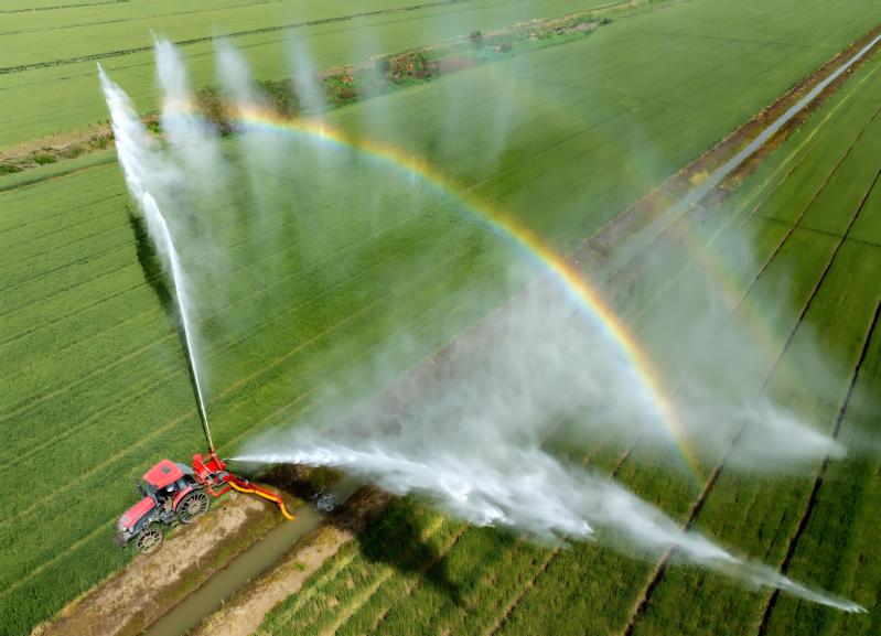 5月2日,正值冬小麥進(jìn)入開花灌漿關(guān)鍵期,江蘇省農(nóng)墾白馬湖農(nóng)場調(diào)集10多臺噴水機(jī)進(jìn)行分區(qū)抗旱作業(yè),確保近5萬畝冬小麥增產(chǎn)增收。圖為工作人員駕駛噴水機(jī)對麥田進(jìn)行噴灌作業(yè)。賀敬華 攝 (視覺江蘇網(wǎng)供圖)