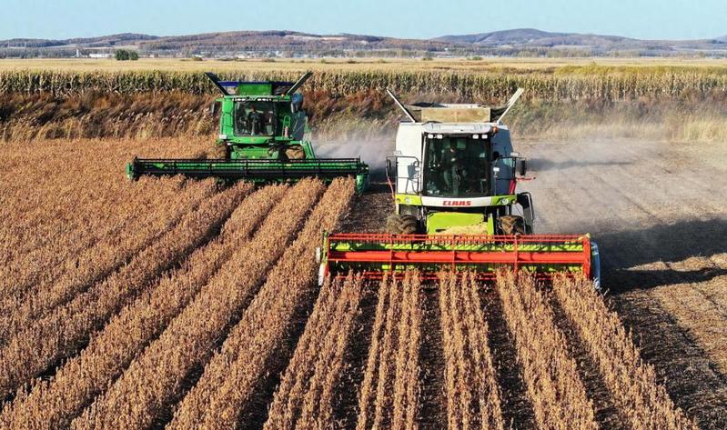 北大荒集團黑龍江八五六農場有限公司的農機在進行大豆收獲作業。(新華社發 王金彬 攝)