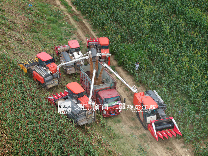 9月21日,江蘇農(nóng)墾江心沙農(nóng)場位于金壇長蕩湖和錢資湖畔外拓基地的8000余畝紅高粱全面開鐮收割。許叢軍 袁偉 攝 視覺江蘇網(wǎng)供圖