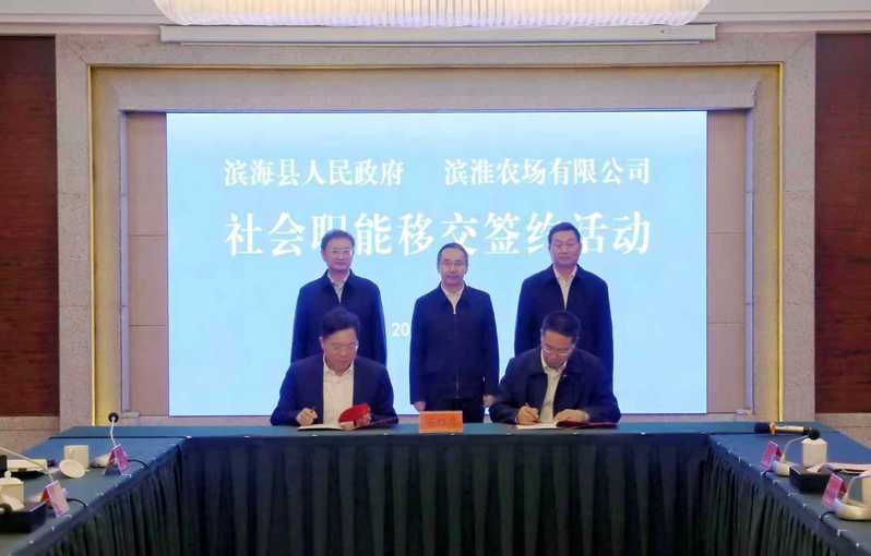 簽約儀式上,濱淮農場與濱海縣人民政府簽訂了社會職能移交協議。集團公司辦公室、濱淮農場、濱海縣相關部門負責人參加活動。