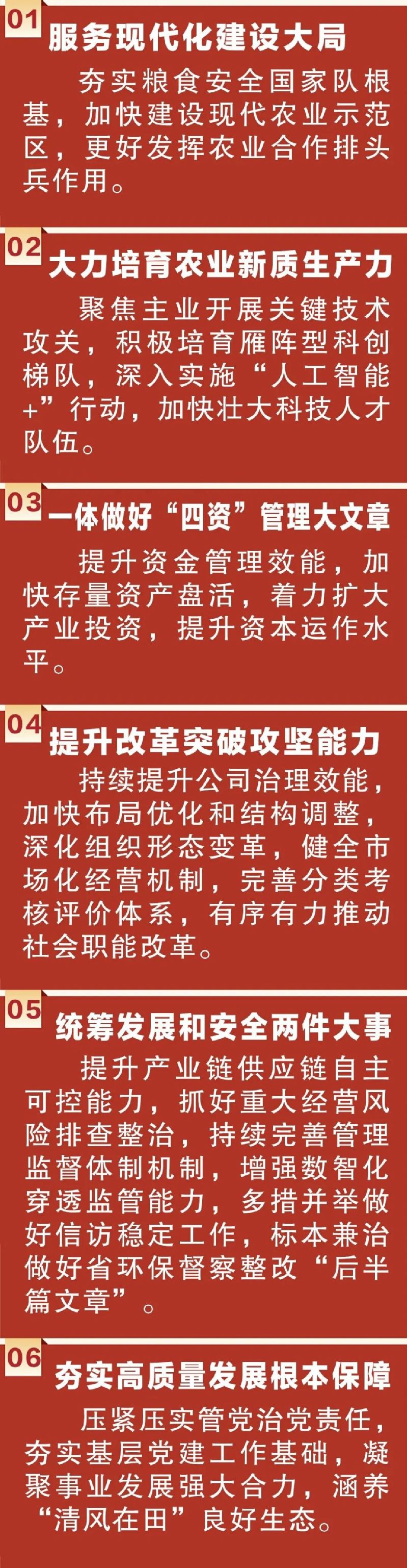 姜建友在報告中指出,2026年,要重點抓好十個方面工作任務,全力優(yōu)存量、擴增量、提質(zhì)量、防風險,確保實現(xiàn)“十五五”開門紅、開門穩(wěn)。要毫不放松抓好糧食生產(chǎn),堅持產(chǎn)量產(chǎn)能、生產(chǎn)生態(tài)、增產(chǎn)增收一起抓,促進良田良種良機良法集成增效,協(xié)同推進優(yōu)土、優(yōu)種、優(yōu)產(chǎn)、優(yōu)儲、優(yōu)銷“五優(yōu)聯(lián)動”,著力提升糧食綜合生產(chǎn)能力。要做大做強農(nóng)業(yè)龍頭企業(yè),做強現(xiàn)代種業(yè),鞏固行業(yè)龍頭,提升農(nóng)場產(chǎn)業(yè),更好發(fā)揮引領帶動作用。要鞏固壯大特色優(yōu)勢產(chǎn)業(yè),推動產(chǎn)業(yè)重構(gòu)、技術(shù)升級、產(chǎn)品迭代和模式創(chuàng)新,鞏固壯大醫(yī)藥健康、城鄉(xiāng)建設服務、商貿(mào)服務產(chǎn)業(yè),為集團高質(zhì)量發(fā)展提供支撐。要開放協(xié)同推進科技創(chuàng)新,強化聯(lián)合創(chuàng)新,注重自主研發(fā),發(fā)展智慧農(nóng)業(yè),以科技創(chuàng)新塑造未來發(fā)展新優(yōu)勢。要堅定不移深化國企改革,完善市場化機制,加快“兩非”“兩資”處置出清,深化辦社會職能改革,充分激發(fā)企業(yè)市場主體活力。要務實高效強化投資管理,以投資賦能產(chǎn)業(yè)升級,多渠道挖掘投資標的,加強項目全過程管理,為高質(zhì)量發(fā)展注入強勁動能。要持之以恒加強品牌建設,堅持以價值提升為核心,統(tǒng)籌做好品牌管理、傳播推廣與產(chǎn)品運營。要積極穩(wěn)妥防范經(jīng)營風險,強化“兩金”管理,強化業(yè)財融合,強化“四位一體”,強化內(nèi)審防線,筑牢安全發(fā)展屏障。要盡心量力做好民生保障,用心做好民生實事,建強產(chǎn)業(yè)工人隊伍,深化文化文明創(chuàng)建,建設和美墾區(qū)。要堅決維護安全穩(wěn)定大局,抓實安全生產(chǎn),做好信訪工作,抓牢生態(tài)環(huán)保,實現(xiàn)高質(zhì)量發(fā)展和高水平安全良性互動。