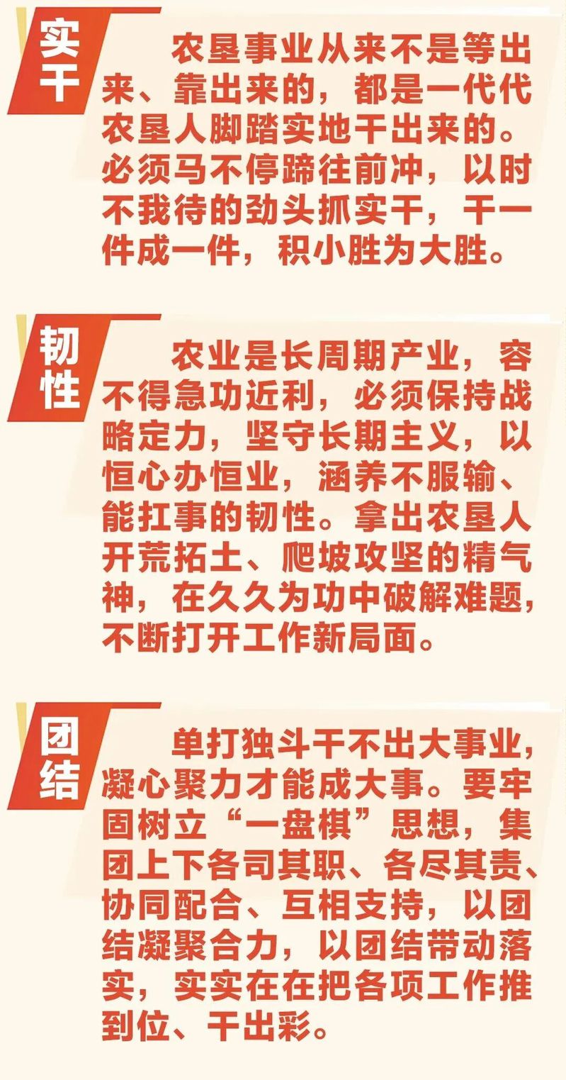會議全面回顧了集團2025年及“十四五”時期改革發(fā)展成果。2025年,集團各項經(jīng)營指標穩(wěn)中有進,糧食生產(chǎn)能力得到鞏固提升,產(chǎn)業(yè)發(fā)展后勁不斷增強,創(chuàng)新驅(qū)動發(fā)展支撐有力,全面深化改革有序落實,企業(yè)治理體系更加完善,黨建引領保障持續(xù)強化,集團總體發(fā)展態(tài)勢保持穩(wěn)健向好。會議還系統(tǒng)總結(jié)了“十四五”期間所取得的寶貴經(jīng)驗,要始終保持戰(zhàn)略定力、穩(wěn)步提升經(jīng)濟實力、有效增強示范能力、充分展現(xiàn)產(chǎn)業(yè)張力、持續(xù)激發(fā)內(nèi)生動力、廣泛凝聚干事合力,這為“十四五”發(fā)展圓滿收官畫上了濃墨重彩一筆,更為集團“十五五”高質(zhì)量發(fā)展奠定了堅實基礎。