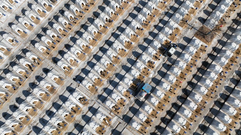 2月18日,蘇墾乳業工人在優然牧業犢牛島添水加料、喂食牛犢。