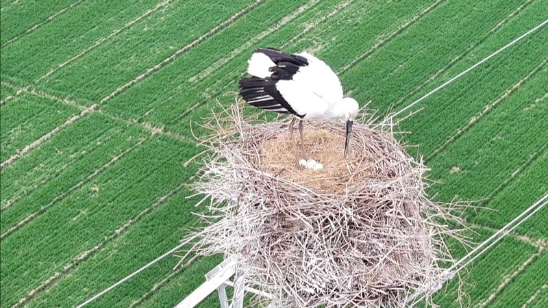 2月13日中午,宋婧用無(wú)人機(jī)拍攝農(nóng)場(chǎng)里小麥生長(zhǎng)的狀況時(shí),發(fā)現(xiàn)一座高壓鐵塔上有兩只大鳥(niǎo)正忙著整理鳥(niǎo)巢,她在不驚擾到鳥(niǎo)兒的情況下進(jìn)行觀(guān)察拍攝,發(fā)現(xiàn)鳥(niǎo)巢里有兩枚蛋。宋婧將視頻發(fā)給專(zhuān)業(yè)人士辨認(rèn),確認(rèn)這兩只大鳥(niǎo)是國(guó)家一級(jí)保護(hù)野生動(dòng)物東方白鸛。過(guò)了幾天,宋婧再次進(jìn)行拍攝時(shí),發(fā)現(xiàn)這對(duì)東方白鸛“夫妻”已經(jīng)產(chǎn)下了四枚鳥(niǎo)蛋。