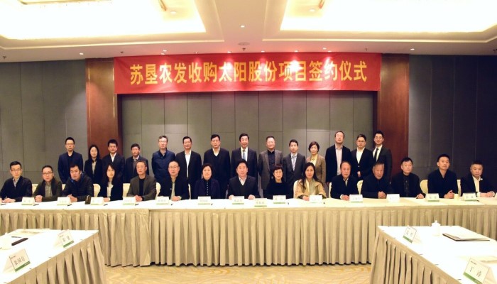 11月15日下午,蘇墾農發股份公司在南京隆重舉辦收購太陽股份項目簽約儀式,集團公司總經理、蘇墾農發股份公司董事長胡兆輝主持本次儀式并講話,集團公司黨委委員、蘇墾農發股份公司總裁蘇志富,太陽股份董事