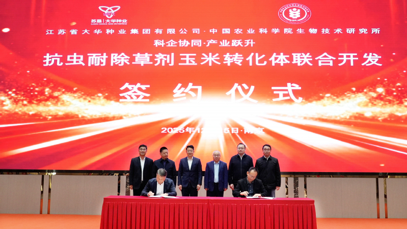 12月15日,省種業集團旗下大華種業與中國農業科學院生物技術研究所(以下簡稱中國農科院生物所)新型抗蟲耐除草劑玉米轉化體聯合開發簽約儀式在南京舉行。集團黨委委員、副總經理,蘇墾農發黨委書記、董事長,省種業集團董事長鄧國新,中國農科院生物所所長、黨委副書記王登山出席簽約儀式并致辭。鄧國新指出,江蘇農墾作為省內農業領域的國有骨干企業,當前正按省委省政府決策部署,全力將旗下的省種業集團打造成為大種業龍頭企業,大華種業作為其核心企業,綜合實力位居全國行業前列,在服務全省乃至全國農業發展中發揮著重要作用。中國農科院生物所是我國農業生物技術領域的國家級戰略力量,在農業生物育種基礎研究、前沿技術探索、安全評價體系構建等方面長期處于國內領先地位。本次合作是省種業集團踐行種業振興戰略、推動“科企協同、產業躍升”的關鍵舉措,標志著雙方在生物育種前沿技術的協同創新上進入實質性推進階段。他希望,雙方要以更加開放、務實、進取的姿態,為打贏種業翻身仗、推動江蘇農業現代化走在前、端牢中國飯碗貢獻應有的力量。王登山指出,大華種業在全國種業行業具有重要的地位和較高的影響力,是我國常規稻麥種子企業的領跑者。中國農科院生物