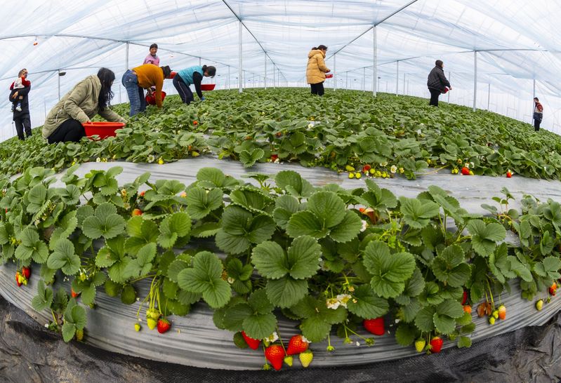 “這里的草莓大棚好大啊,剛拉開大棚門香味就撲面而來了,我去過很多草莓大棚,這么大這么高的還是第一次見,今天真是長見識了。”說此話的是盱眙鄉村紅色主播張麗麗,張麗麗擁有100多萬粉絲,在看到三河農場直播間后,跟隨航拍視頻來到了三河農場農業科技示范園,并在大棚里進行了現場直播,一時間使三河農場的團購鮮果草莓采摘“走火”盱眙周邊,慕名前往三河體驗采摘樂趣的游客絡繹不絕。家住盱眙縣城的游客高露震說,“我是特意星期六下午來采摘的,因為孩子想看看你們是怎么直播的,說要看看直播的阿姨和叔叔,今天總算是見到真人了,孩子們不僅吃到了草莓,還見到了你們,開心的不得了。”“我是下午刷抖音看到三河農場的直播間,然后就開車從淮安過來了,早就聽說三河農場的草莓特別好吃,今天到這里一看果然震撼,這么大的草莓大棚還真是第一次看見,一個大棚里能吃到好幾個品種不同口味的草莓,這也是第一次體驗,春節放假,我還會帶著老人和孩子來采摘。”來自淮安市區的張先生高興的說。時下正是寒冬臘月,室外溫度達到了零度以下,但走進三河農場農業科技示范園的草莓溫室大棚里卻溫暖如春,只見大棚里一片綠郁蔥蔥,肥厚翠綠的草莓葉間夾著朵朵白色的小花,綠
