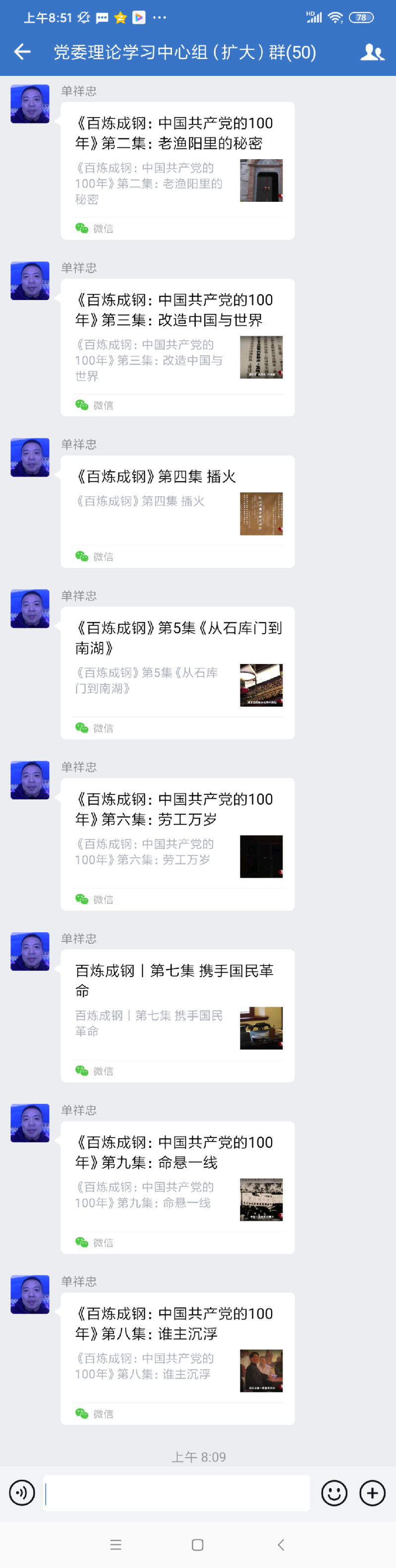 淮海農(nóng)場公司在昨天傍晚接到江蘇農(nóng)墾黨史學(xué)習(xí)教育第三組《關(guān)于組織收看百集微紀(jì)錄片百煉成鋼:中國共產(chǎn)黨的100年”的通知》后,立刻借助企業(yè)微信平臺黨委理論學(xué)習(xí)中心組(擴(kuò)大)群進(jìn)行轉(zhuǎn)發(fā)落實(shí),農(nóng)場黨委書記單祥忠在今天上午便將搜集來的《百煉成鋼:中國共產(chǎn)黨的100年》的紀(jì)錄片第1至第9集的視頻發(fā)布的學(xué)習(xí)群中,并以此來進(jìn)一步激發(fā)起廣大黨員干部職工學(xué)習(xí)黨史的熱情,在方便大家觀看學(xué)習(xí)中,不斷提升黨史的學(xué)習(xí)教育成效。